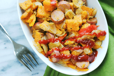 This meal is very versatile, so feel free to substitute whatever you have on hand. Sausages (pork or chicken) can be used instead of hot dogs; russet potatoes instead of sweet potatoes. Or use all of the above!