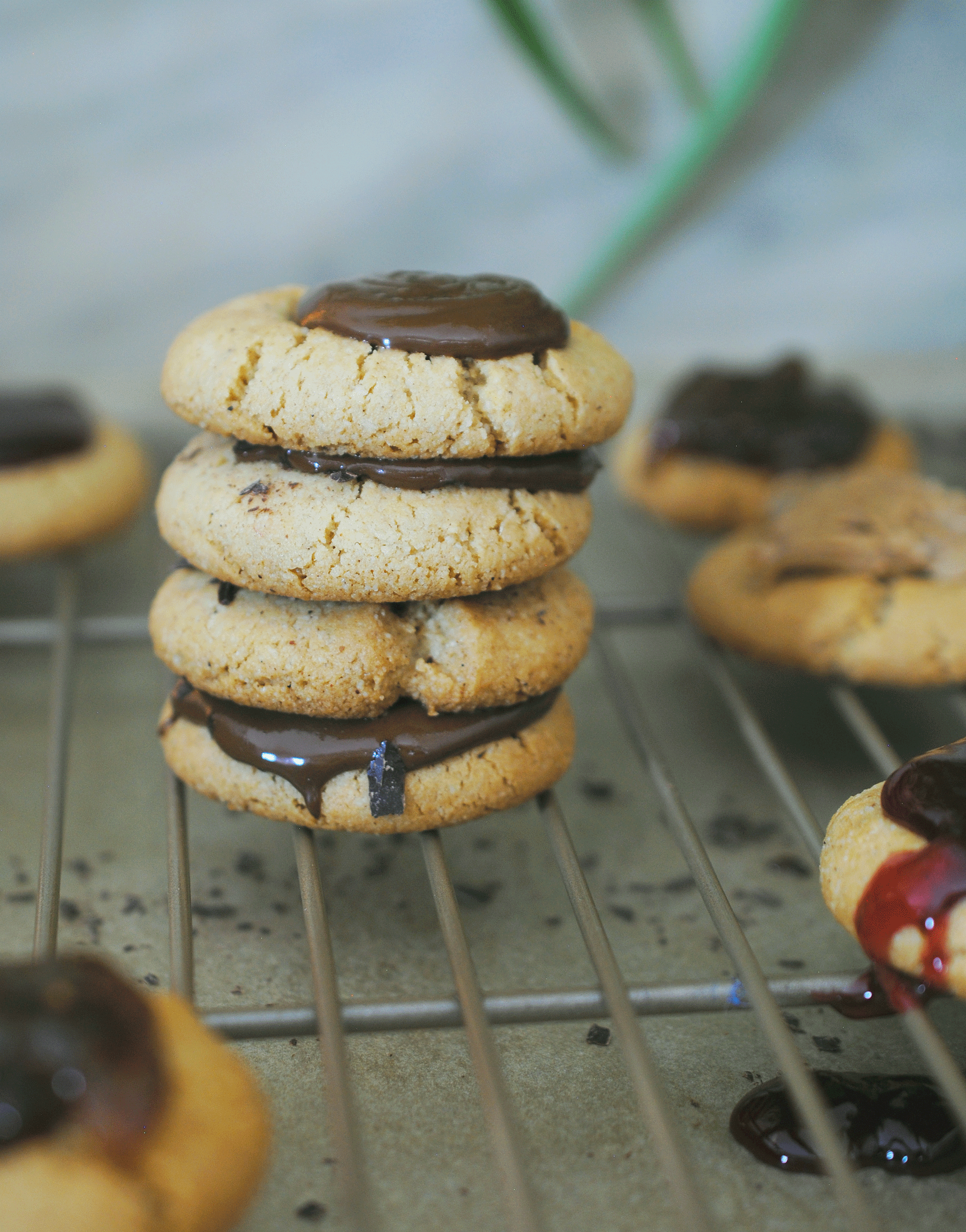 What I like about thumbprint cookies is that you can use whatever filling tickles your fancy at the time of baking. Nut butters, jams (perhaps my raspberry chia jam?), nutella, caramel — you could even press a Hershey Kiss into the dough.